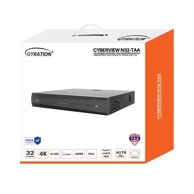 The Gyration Cyberview N32-TAA Network Video Recorder (NVR) supports up to 32 IP cameras and provides up to 4K high-definition recording for your IP video surveillance applications. It is also compatible with Ultra 265, H.265, and H.264 video compression formats. The CyberView N32 is ideal for a variety of circumstances where image details are critical for identification, such as residential areas, retail stores, businesses, office buildings, hotels, transportation hubs, and many more. The embedded programming allows for centralized management of your IP camera settings, including configuration, information import/export, real-time information display, two-way audio, firmware upgrades, etc.