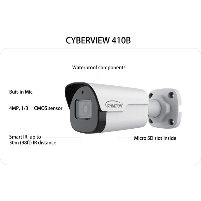 The Gyration CYBERVIEW 410B-TAA 4MP Smart IP KEY FEATURES Security Camera is an intelligent bullet-type camera designed for indoor or outdoor applications. It comes with intelligent perimeter protection, including cross-line, intrusion, enter and exit area, etc. The camera is equipped with a fixed lens with focal-length options to capture various viewing angles. Compatible with Ultra 265, H.265, H.264, MJPEG video compression standards. Starlight technology ensures ultra-high image quality in low illumination environments. Its 4MP CMOS sensor and Wide Dynamic Range (WDR) technology allow the camera to capture crisp and clear images in most lighting environments. IP67 waterproofing standards provide the camera with superior protection from inclement weather conditions.