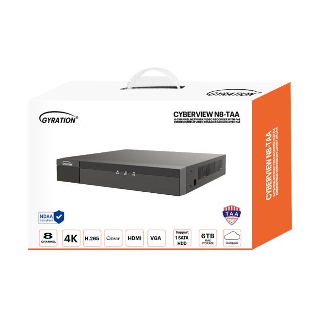 The Gyration CyberView N8-TAA 4K Network Video Recorder (NVR) offers excellent performance and high recording quality for IP video surveillance applications. Compatible with applications where